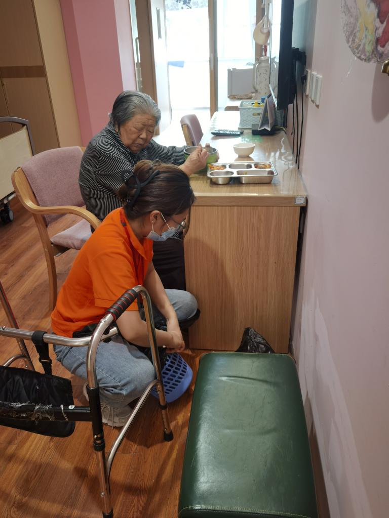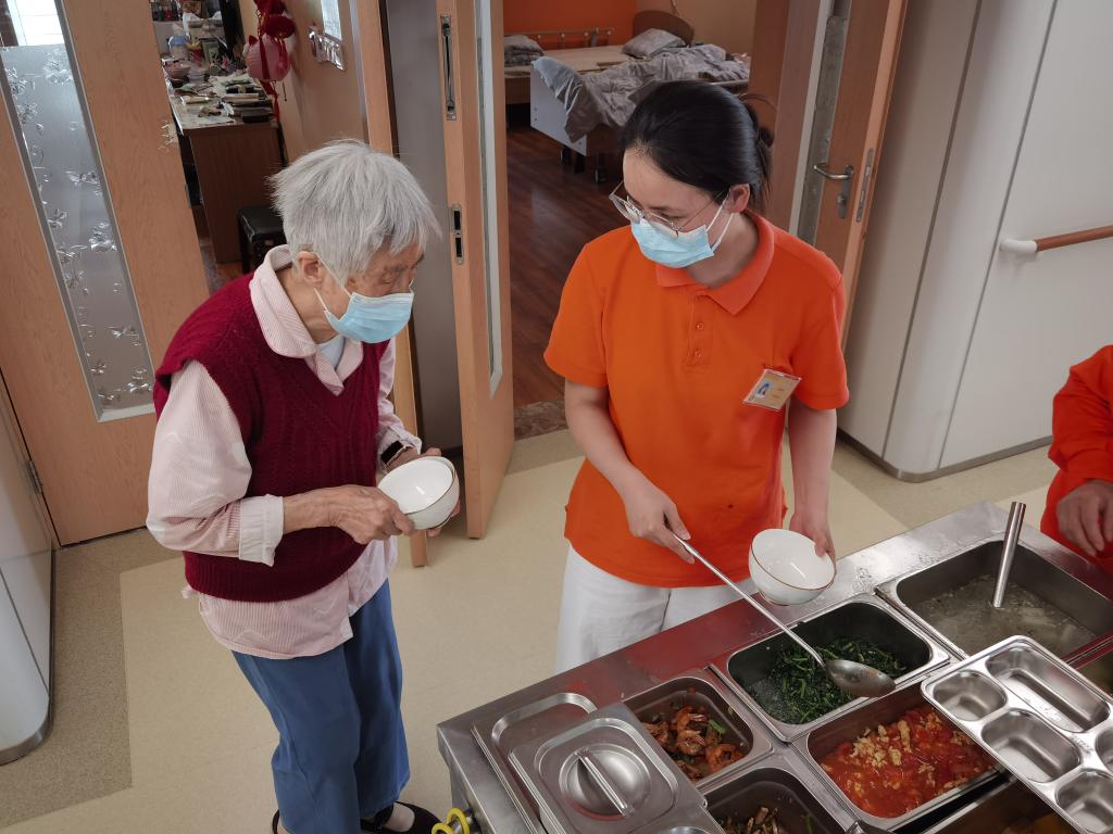 24岁的陈晓晓是7楼的护理领班,她与3名护理员共同照看着楼层31位老人。她熟悉每位老人的饮食习惯,荤素搭配、菜量大小,她几乎不用问,就能将老人的午餐分好。老人用餐期间,陈晓晓匆忙吃完工作餐,就准备在楼道巡查。
