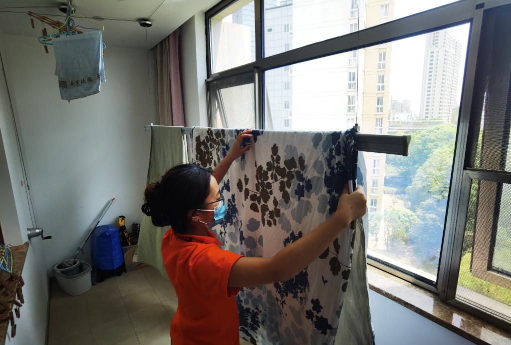 5月4日,曹艺潇在为入住老人整理晾晒的被套。新华社记者 朱旭东 摄
