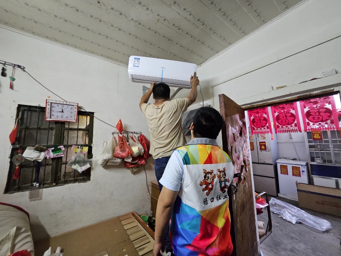 方案确定后,社工负责逐户核实家庭线路条件,志愿者协助搬运、清理安装通道,禄口街道慈善基金则在最短时间内完成比价采购。当天上午8点30分,1支专业安装队伍、2名社工与志愿者分片集结,趁着台风天过去,按“一户一表、一户一策”推进:量线距、打支架、调温度,每道工序无缝衔接。