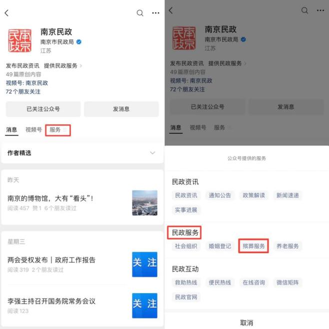 方式一:关注“南京民政”微信公众号,点击“服务”—“民政服务”—“殡葬服务”进入。
