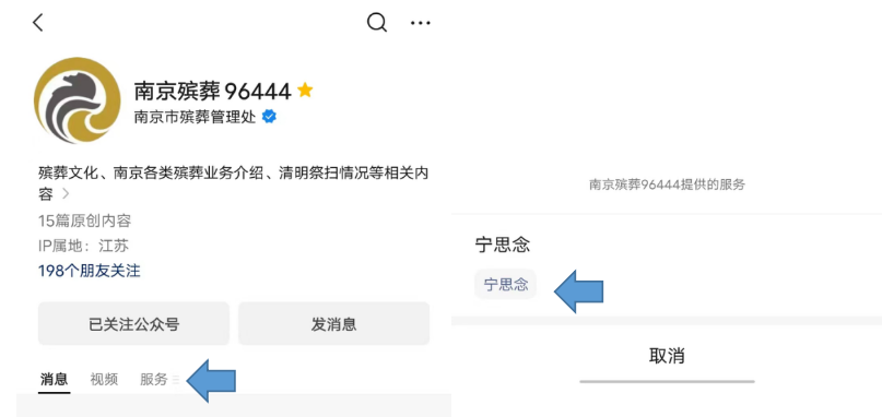 方式二:关注“南京殡葬96444”微信公众号,点击“服务”—“宁思念”进入。