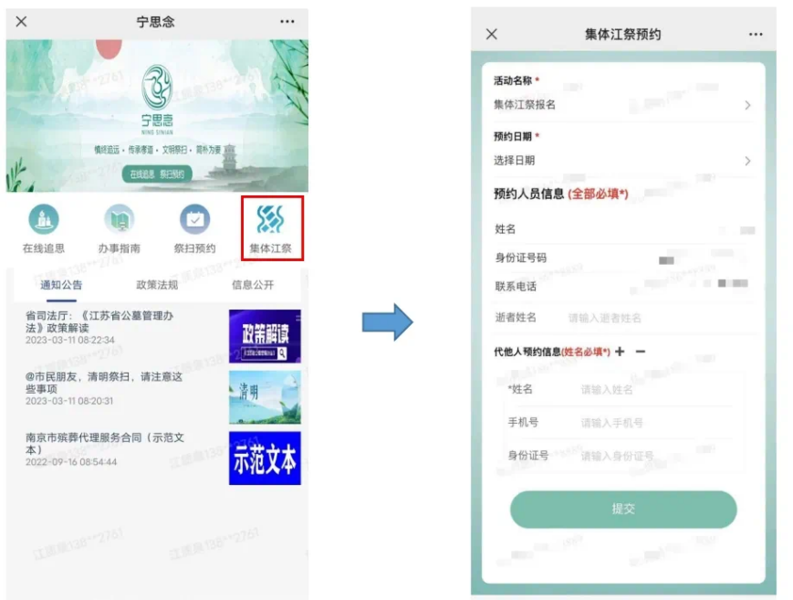 线上预约。可通过“南京民政”“南京殡葬96444”微信公众号或“我的南京”APP登录“宁思念”平台,选择“集体江祭”进行预约。