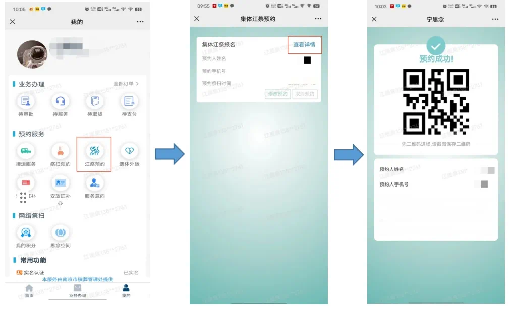 用户可在“我的”功能中,点击“江祭预约”查看预约记录,并点击“查看详情”显示预约二维码。
