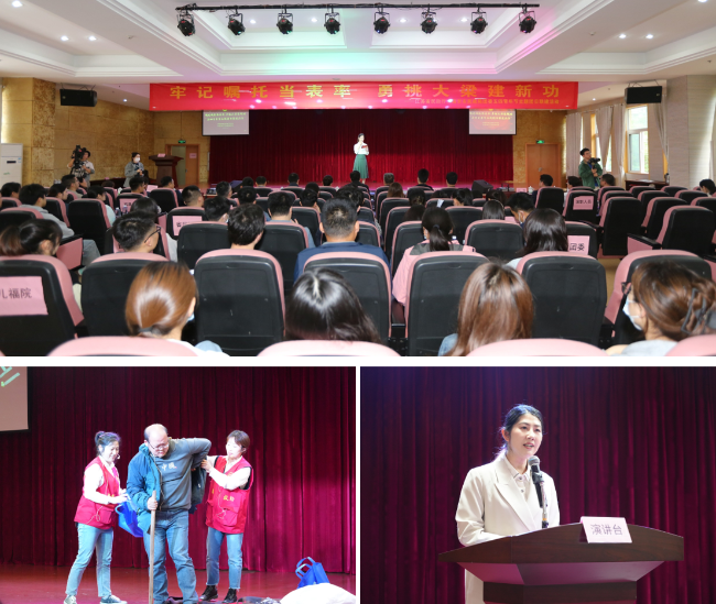 在“青春故事分享会”环节,来自南京市救助管理站与市慈善事业发展中心的团员们,带来了自编自演的情景剧《救助寻亲,照亮回家的路》,真实再现了奋战在救助一线的民政青年,用爱心细心和恒心帮助流浪乞讨人员“圆梦回家”的故事。来自南京市祖堂山社会福利院青年代表,作了《筑牢安全基层线,我用青春守夕阳》的演讲,向大家分享了守护养老院老人舒心安养的工作举措以及坚守底线思维、助力成长成才的思考。
