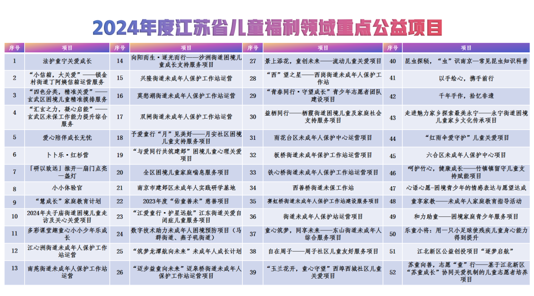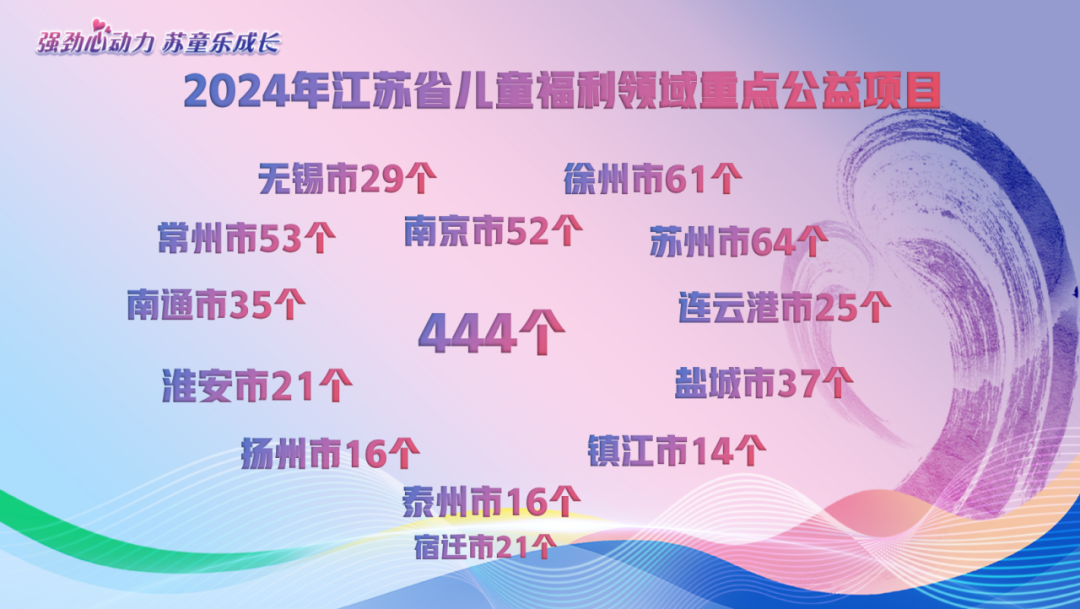 全省民政系统深入整合儿童关爱保护需求,2024年共计开发出444个儿童公益项目,其中南京地区实施52个,涵盖关爱保护、权益维护、心理关怀等十大类别。