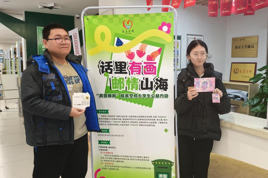 2025年新年伊始,南京市慈善事业发展中心联合中国邮政南京分公司在南京大学校园邮局开展“话里有‘画’‘邮’情山海”校园邮局慈善空间大学生公益行动。正在就读南大研究生二年级的张同学就是在现场参加活动的爱心师生之一,在她的笔下诞生了活动的第一张明信片。
