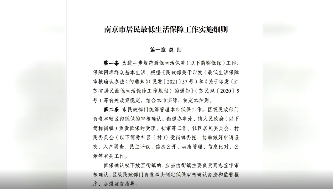 近日,南京市发布《南京市居民最低生活保障工作实施细则》,织牢社会救助兜底保障网,守好困难群众基本生活底线。